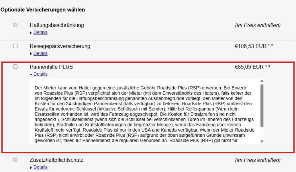 Je nach Anbieter heißt das Paket etwas anders. Bei Alamo taucht es zum Beispiel als Roadside Plus (RSP) oder Pannenhilfe PLUS bzw. (in manchen Fällen) Roadside Assistance Protection auf. Inhaltlich geht es fast immer um dasselbe: Du bekommst Hilfe, ohne dass dir für den Einsatz extra Gebühren berechnet werden. Ohne Paket bekommst du in der Regel auch Hilfe, nur eben bei bestimmten Vorkommnissen gegen Rechnung.