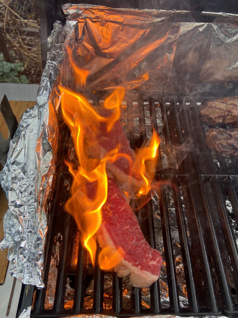 Den Grill auf hohe Temperatur vorheizen (ca. 250°C), besonders die Sizzlezone. Ich lasse den Grill 15 Minuten vorheizen, damit sind die Grillroste schön gleichmäßig heiß. Das Roastbeef dort zunächst 1-2 Minuten auf jeder Seite anbraten, um eine schöne krosse Kruste zu erhalten – vor allem auf dem Fettdeckel. Das Fett sollte dabei schön brutzeln und goldbraun werden.